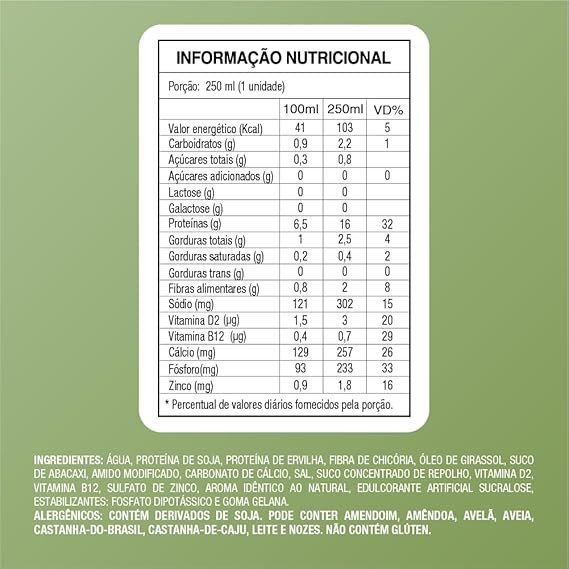 Ingredientes ‎Ingredientes: Água, Proteína de soja, Proteína de ervilha, Fibra de chicória, Suco concentrado de abacaxi, Amido modificado, Café solúvel em pó, Óleo de girassol, Carbonato de cálcio, Sal, Suco concentrado de repolho, Vitamina D2, Vitamina B12, Aroma idêntico ao natural, Edulcorante artificial sucralose, Estabilizantes: goma gelana e fosfato dipotássico.