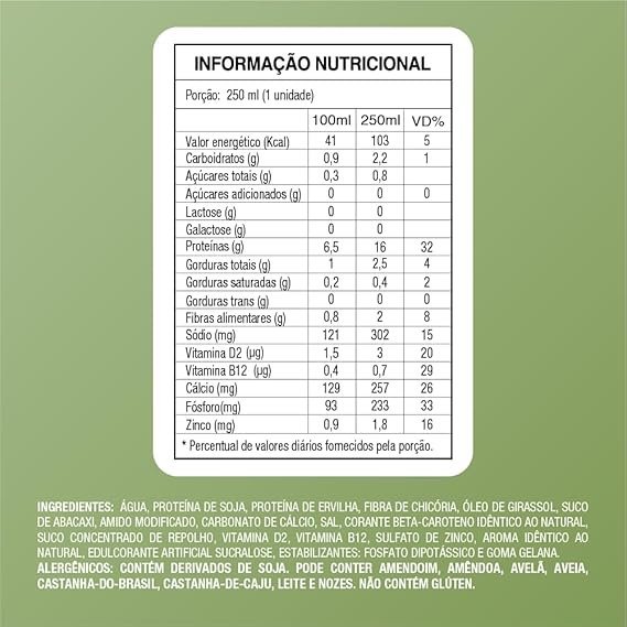 | Ingredientes | Ingredientes: Água, Proteína de soja, Proteína de ervilha, Fibra de chicória, Suco concentrado de abacaxi, Amido modificado, Óleo de girassol, Carbonato de cálcio, Sal, Suco concentrado de repolho, Vitamina D2, Vitamina B12, Aroma idêntico ao natural, Corante beta-caroteno idêntico ao natural, Edulcorante artificial sucralose, Estabilizantes: goma gelana e fosfato dipotássico. |