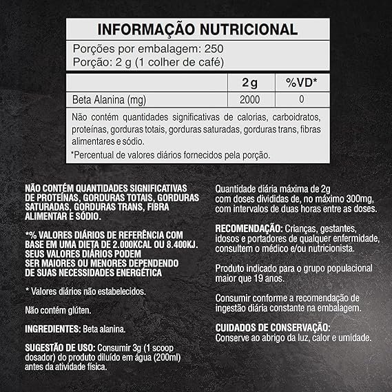 Para performance atlética usualmente é indicado a dose de 3 g (meia colher de chá) a 6 g (uma colher de chá) por dia ou conforme a indicação de especialista. Para tanto, diluir 3 g da Beta Alanina em 200 ml de água ou outra bebida de sua preferência e tomar antes do treino.