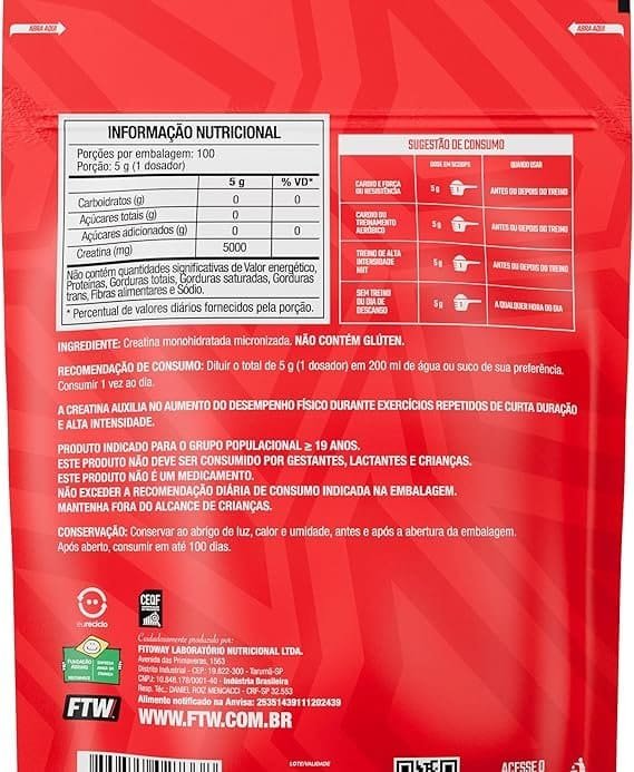 Em até 1x de R$ 21,79 sem juros FTW Creatina Monohidratada 100% Pura – Explosão de Energia, Força e Resistência – Absorção Rápida para Ganho de Massa e Performance (Refil 500G)