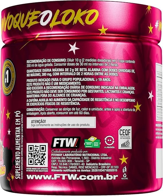 Desperte seu potencial máximo com Diabo Verde #Pre-Workout da FTW, um suplemento alimentar formulado especialmente para quem busca mais energia, foco e desempenho durante os treinos. Sua fórmula combina aminoácidos essenciais com cafeína microencapsulada, proporcionando estímulo de forma gradual e duradoura. Ideal para ser consumido antes das atividades físicas, esse pré-treino é indicado para atletas e praticantes de atividades intensas, sempre com orientação de um profissional habilitado. BENEFÍCIOS: 💪 Fórmula Energizante: Com cafeína microencapsulada para liberação gradual, ideal para manter o foco e a disposição. ⚡ Aminoácidos de Alta Qualidade: Contém beta-alanina, L-arginina, L-taurina e L-tirosina. 🧪 Isomaltulose: Carboidrato de baixo índice glicêmico que auxilia no fornecimento de energia sustentada. 🔁 Rendimento Inteligente: Pote com 300g rende aproximadamente 30 porções. ✅ Sem Glúten: Seguro para quem possui restrições alimentares. COMO CONSUMIR: Dilua 2 medidas dosadoras (10g) em 200ml de água gelada e consuma 30 minutos antes do treino. A dose diária máxima de beta-alanina é de 2g, podendo ser fracionada com no mínimo 2 horas entre as porções. INFORMAÇÕES IMPORTANTES: Produto indicado para adultos (≥ 19 anos). Não deve ser consumido por gestantes, lactantes ou crianças. Este produto não é um medicamento. Conserve em local seco, fresco e protegido da luz. Após aberto, consumir em até 45 dias. Não exceda a recomendação diária indicada na embalagem. Mantenha fora do alcance de crianças.