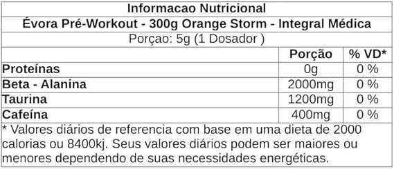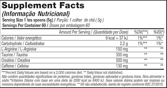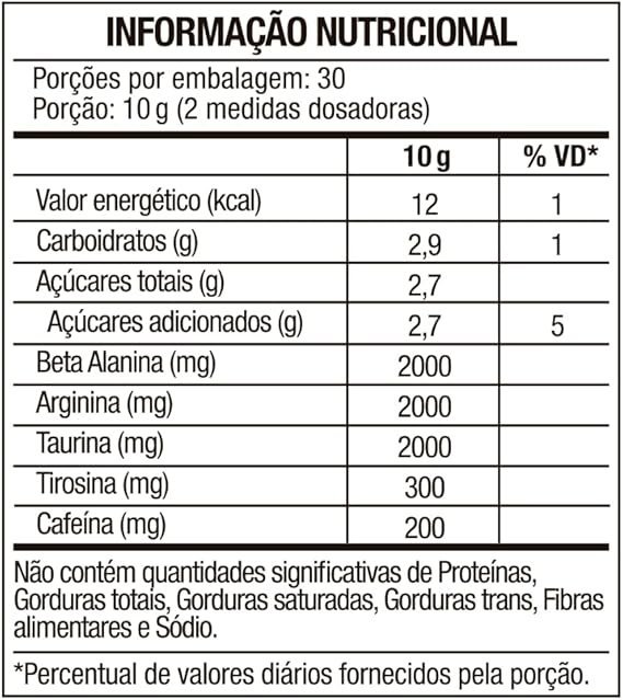 Porção recomendada ‎Diluir 2 medidas dosadoras (10g) em 200ml de água gelada. Consumir 30 minutos antes da atividade física. A dose diária máxima de beta-alanina é de 2g, podendo ser dividida com intervalo mínimo de 2 horas entre as porções.