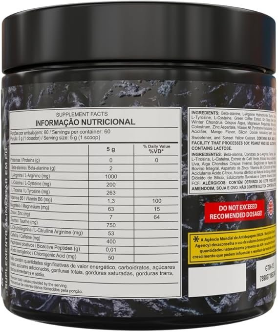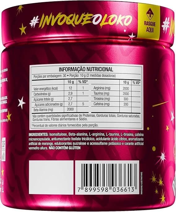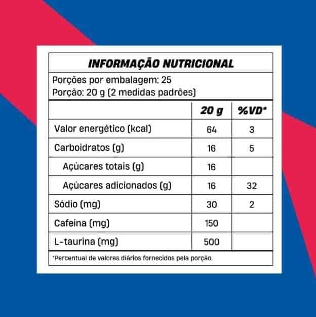 Isomaltulose, beta-alanina, L-arginina, L-taurina, L-tirosina, cafeína microencapsulada, antiumectante fosfato tricálcico, acidulante ácido cítrico, edulcorantes sucralose e acessulfame de potássio, aromatizante e corante (conforme o sabor). NÃO CONTÉM GLÚTEN.