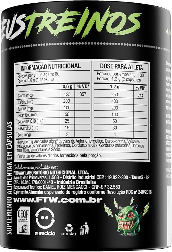 Cafeína Anidra: Estimula o sistema nervoso central, promovendo energia e reduzindo a sensação de cansaço. Taurina: Reconhecida por suas propriedades antioxidantes, contribui para a redução da fadiga muscular e melhora do desempenho físico. L-Carnitina: Auxilia no transporte de ácidos graxos para as mitocôndrias, favorecendo a oxidação de gorduras. Coenzima Q10: Essencial para a produção de energia celular, além de atuar como antioxidante. Picolinato de Cromo: Ajuda no metabolismo de macronutrientes (proteínas, carboidratos e gorduras) e no controle dos níveis de glicose no sangue. Resveratrol: Polifenol com propriedades antioxidantes, conhecido por combater os radicais livres e promover a saúde celular.