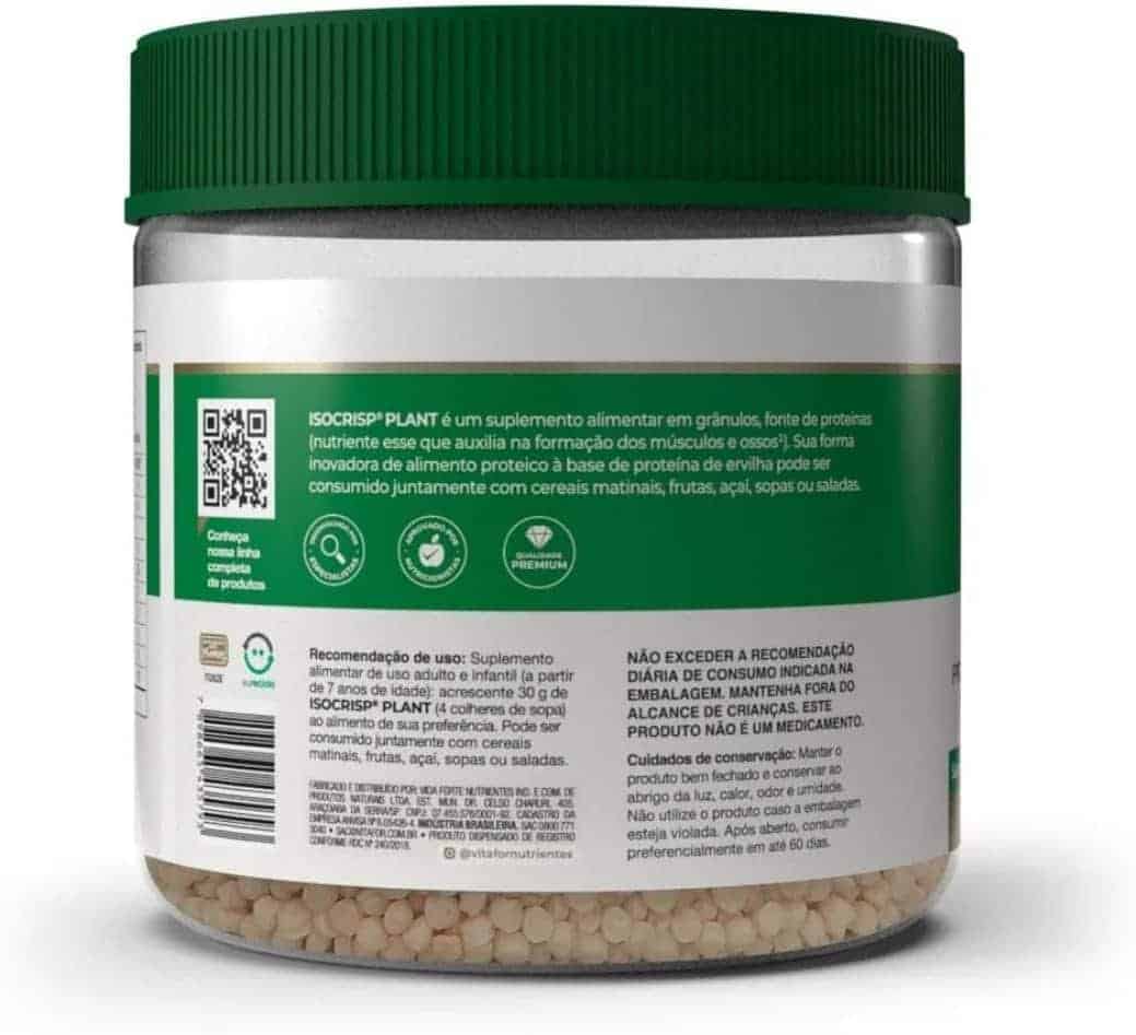 Recomendação de uso: Suplemento alimentar de uso adulto e infantil ( a partir de 07 anos de idade): Acrescente 30g de ISOCRISP PLANT (1 colher medida) o alimento de sua preferencia. Pode ser consumido juntamente com cereais matinais, frutas, gelatinas, açaí, sopas e saladas.