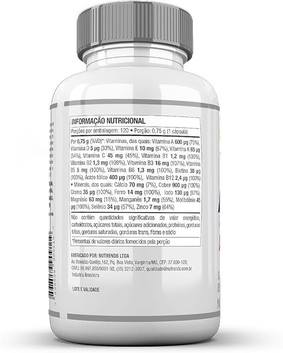 Ácido ascórbico, sulfato ferroso, nicotinamida, sulfato de zinco, acetato de DL-alfa-tocoferol, D-pantotenato de cálcio, sulfato de manganês, acetato de retinol, selenato de sódio, bisglicinato de cobre, vitamina D3 (Colecalciferol), cloridrato de tiamina, cloridrato de piridoxina, riboflavina, fitomenadiona, picolinato de cromo, ácido fólico, iodeto de potássio, molibdato de sódio, D-biotina, cianocobalamina, agente de massa celulose microcristalina (gel de celulose), revestimento (estabilizante hidroxipropilmetilcelulose, agente de massa etilcelulose, umectante triacetina, corantes dióxido de titânio, óxido de ferro amarelo e tartrazina), antiumectante dióxido de silício e estabilizante croscarmelose sódica.