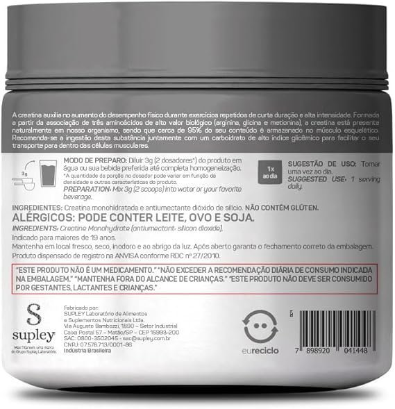 SUGESTÃO DE USO: A diluição recomendada é de 3g (2 dosadores) do produto em água ou sua bebida preferida até completa homogeneização. Ou como indicação profissional. INGREDIENTES: Creatina monohidratada e antiumectante dióxido de silício. NÃO CONTÉM GLÚTEN. ALÉRGICOS: PODE CONTER DERIVADOS DE OVO, LEITE E SOJA.
