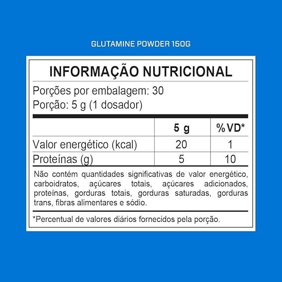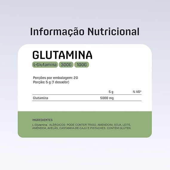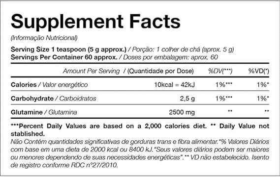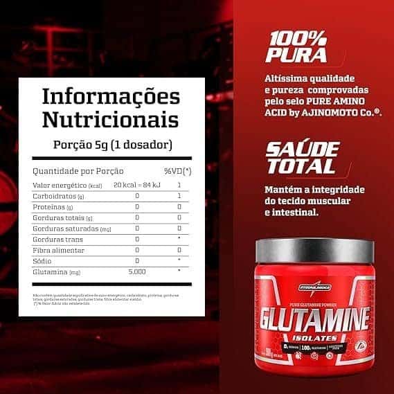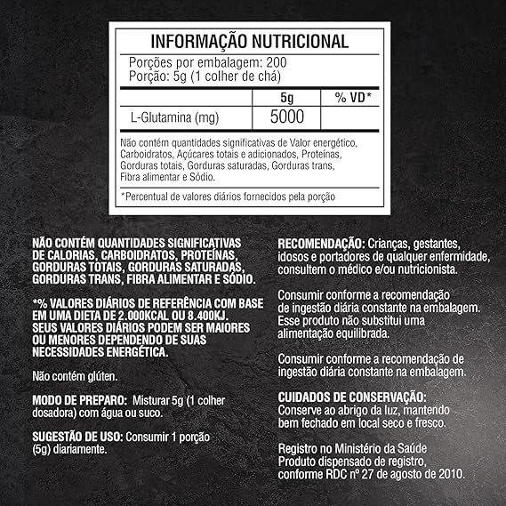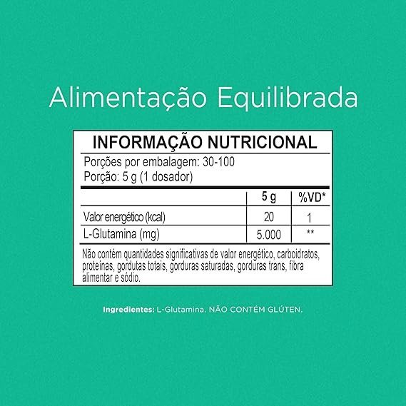 O aminoácido glutamina é o mais abundante aminoácido de forma livre encontrado no tecido muscular. A glutamina é utilizada na síntese de proteína e na construção de tecido muscular. O mecanismo se dá pelo aumento de volume celular e da pressão osmótica, estimulando a síntese. Uma suplementação com L-G assegura que altos níveis de glutamina dentro das células sejam mantidos, pois a glutamina é capaz de captar água para o meio intracelular. MODO DE PREPARO E SUGESTÃO DE CONSUMO: A diluicão recomendada é de 5g (1 colher de chá) do produto em até 100mL de água ou bebida preferida. Utilizar L-Glutamina para suplementar uma dieta enteral em quantidade de acordo com orientação de nutricionista ou médico. A glutamina deve ser administrada o mais rapidamente possível apo´s a sua diluição. INGREDIENTES: L-Glutamina. NÃO CONTÉM GLÚTEN. NÃO CONTÉM LACTOSE. PESO LÍQUIDO: 0,300kg