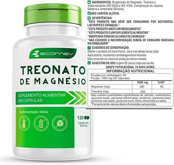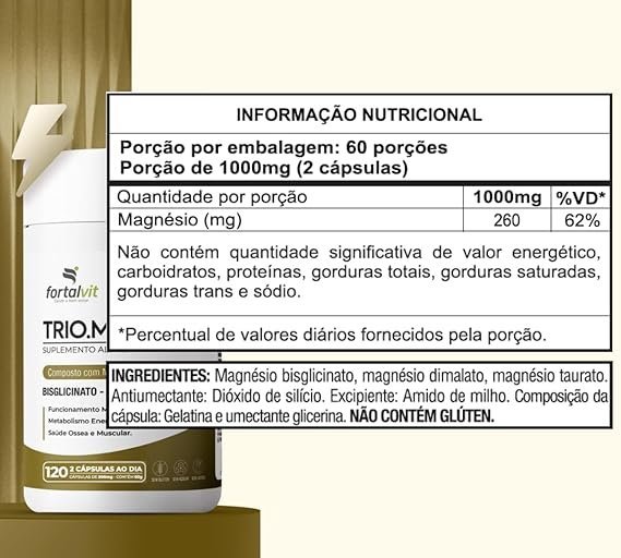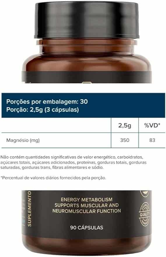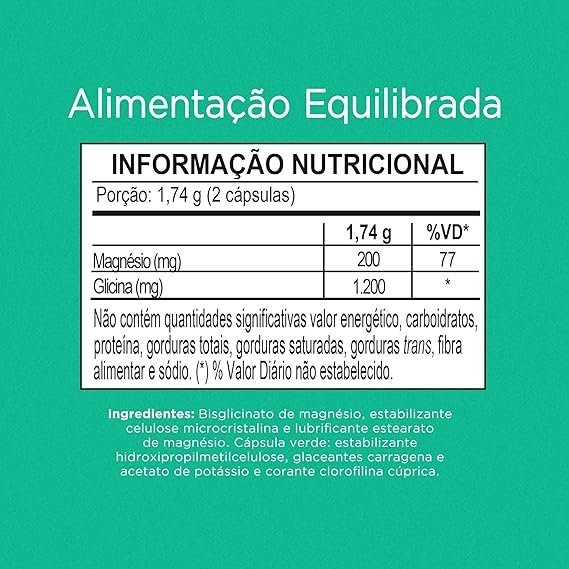 Bisglicinato de magnésio, malato de magnésio, taurato de magnésio, citrato de magnésio, amido de milho, antiumectantes estearato de magnésio e dióxido de silício. Cápsula vegetal: água purificada, espessantes hidroxipropilmetilcelulose e carragena, corante inorgânico dióxido de titânio.