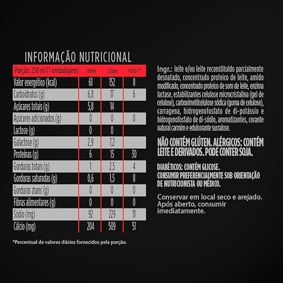 | Ingredientes | Leite parcialmente desnatado, concentrado proteico de leite em pó, amido modificado, concentrado proteico de soro de leite em pó, enzima lactase, estabilizantes celulose microcristalina, carboximetilcelulose, carragena, fosfato dipotássico e fosfato dissódico, aromatizantes, corante natural carmim e edulcorante sucralose. ÃO CONTÉM GLÚTEN. ALÉRGICOS: CONTÉM LEITE E DERIVADOS. PODE CONTER SOJA. DIABÉTICOS: CONTÉM GLICOSE. CONSUMIR PREFERENCIALMENTE SOB A RECOMENDAÇÃO DE NUTRICIONISTA OU MÉDICO |
