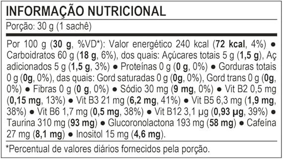 Maltodextrina, água purificada, taurina (93mg/30g), glucoronolactona (58mg/30g), cafeína (8,1mg/30g), nicotinamida (niacina), inositol (4,6mg/30g), pantotenato de cálcio (ácido pantotênico), cloridrato de piridoxina (vitamina B6), riboflavina (vitamina B2), cianocobalamina (vitamina B12), amido de milho ceroso (waxy maize), regulador de acidez citrato monossódico, acidulante ácido fosfórico, aromatizantes, conservadores sorbato de potássio e benzoato de sódio e edulcorante sucralose. NÃO CONTÉM GLÚTEN.