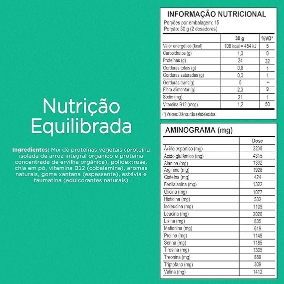 True vegan blend (proteína isolada de ervilha, proteína isolada de arroz integral), amêndoa castanha de caju triturada, chia em pó, vitamina B12 (cianocobalamina), leite de coco em pó (sem lactose), TCM – Triglicerídeos de Cadeia Média), aromas naturais, espessante goma xantana e goma guar, edulcorantes naturais (glicosídeos de steviol e taumatina). NÃO CONTÉM GLÚTEN | ALÉRGICOS: CONTÉM CASTANHA DE CAJU. PODE CONTER SOJA, AMENDOIM