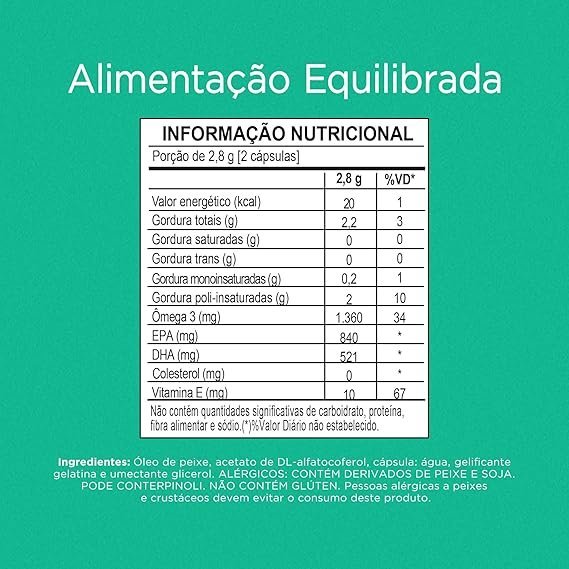 Ômega 3 epa dha -.vitafor. Produto a base de óleo de peixe extraído de águas frias e profundas das regiões polares, sendo rico em ácidos graxos de cadeia longa, da série ômega 3. Seus constituintes são: o ácido eicosapentaenóico (epa) e o ácido docosahexaenóico (dha), sendo considerados ácidos graxos essenciais. Também possui vitamina e em sua composição. A matéria-prima é livre de metais pesados, garantindo a pureza do óleo através da certificação ifos (international fishoil standards) benefícios: alegação de propriedade funcional aprovada; o consumo de ácidos graxos ômega 3 auxilia na manutenção de níveis saudáveis de triglicerídeos, deSDe que associado a uma alimentação equilibrada e hábitos de vida saudáveis; ômega 3 rico em epa e dha; com vitamina e em sua composição.diferenciais: extraído de águas frias e profundas das regiões polares; o programa internacional de padrões de óleo de peixe (ifos) é o único programa de testes e certificação de terceiros para óleos de peixe. Definindo os padrões mais altos do mundo em pureza, potência e frescor.
